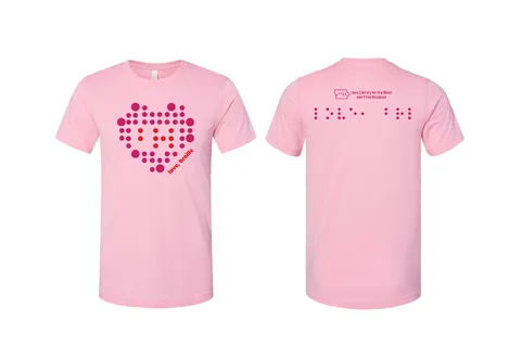 To help us celebrate the 2026 Iowa Regional Braille Challenge on February 14, 2026, the Library is pleased to work with local, small business, The Side Garage, again this year for the Braille Challenge t-shirt. In honor of Valentine's Day, the theme for 2026 is Love, Braille.